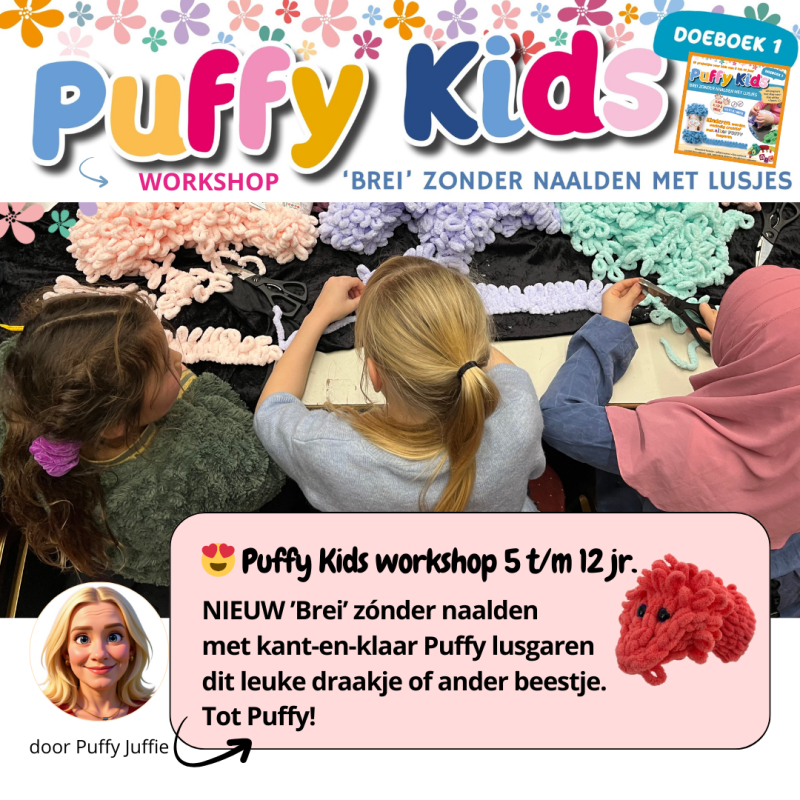 - In weekenden geven we ookspeciale Puffy Kids workshops met Puffy Juffie Tina. Ze heeft het 1e Puffy Kids Doeboek geschreven. 100 pagina's met stap-voor-stap foto's om als kind zelf hele leuke Puffy projecten te maken. In de Puffy Kids workshop maken we iets uit haar boek.