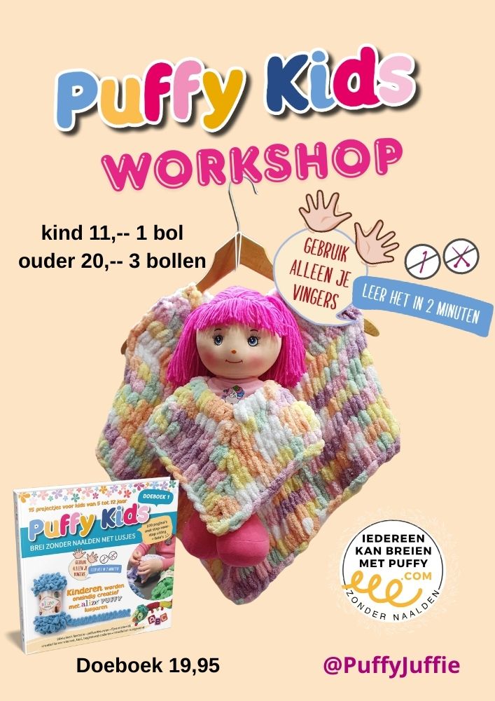Tijdens Puffy workshop 'breien met Puffy' leer je de basis Puffy breien en gaan je met de visgraat steek een woonkussen maken.