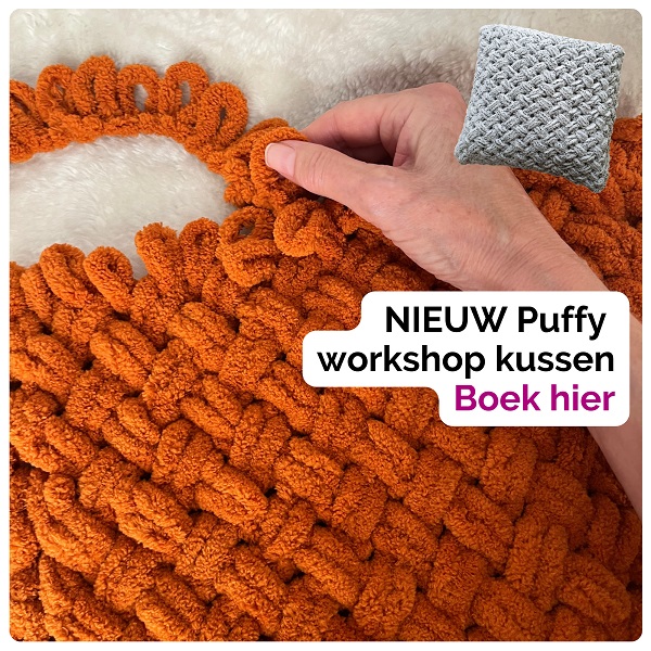 Tijdens Puffy workshop 'breien met Puffy' leer je de basis Puffy breien en gaan je met de visgraat steek een woonkussen maken.